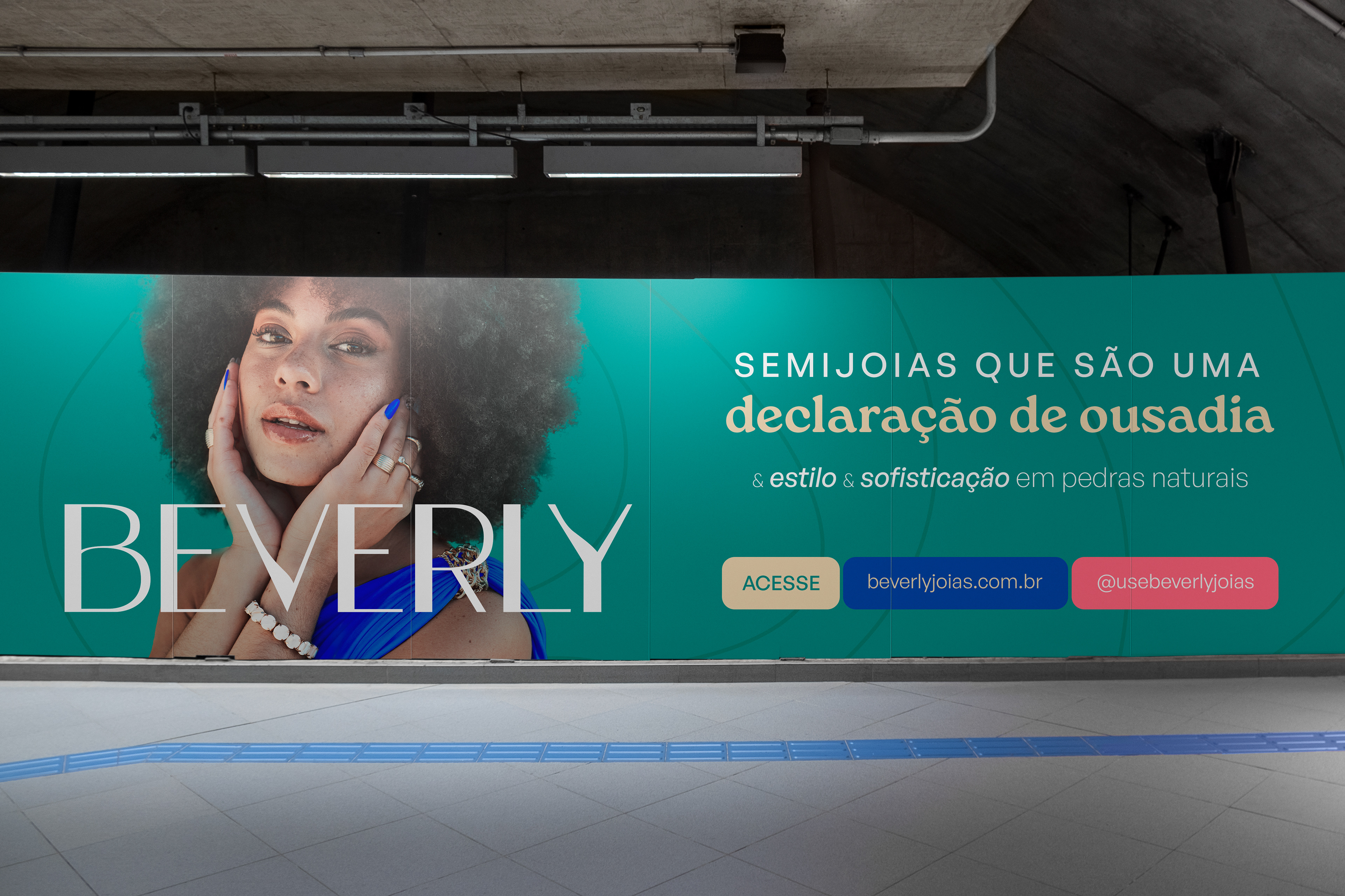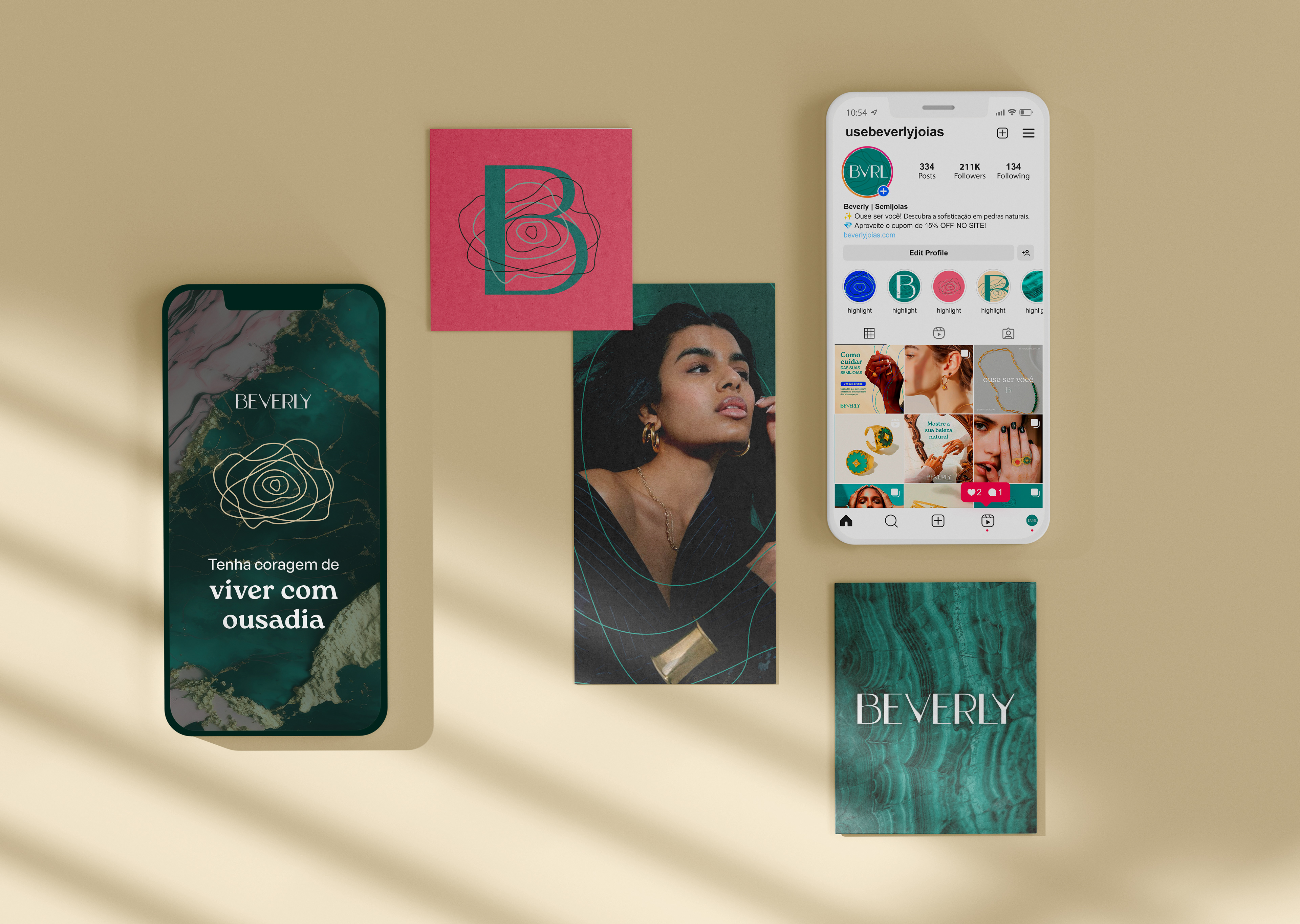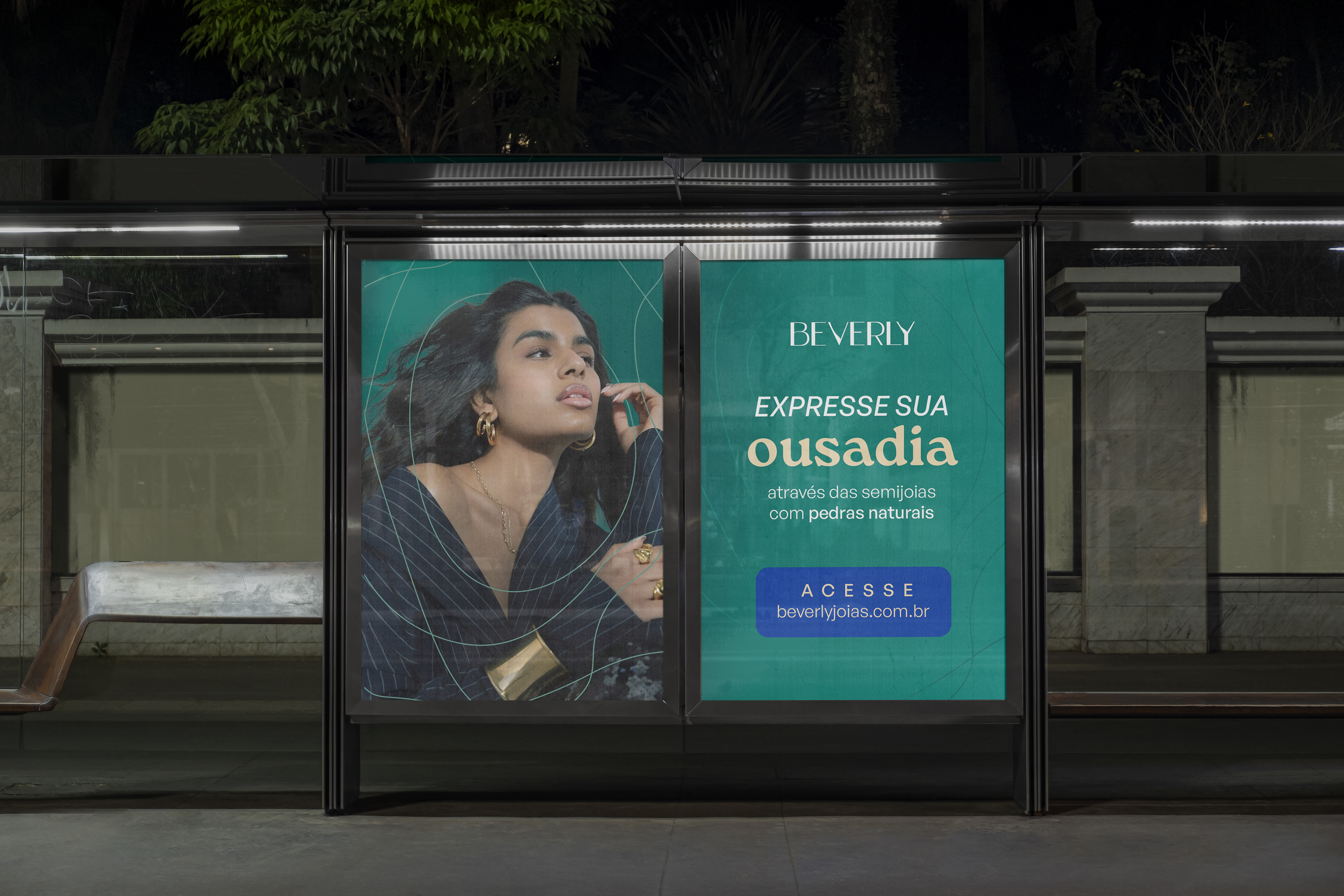 Essa é a Beverly, um ecommerce especializado em semijoias com pedras naturais que queria evitar atrelar sua imagem ao lado místico desse tipo de material, preferindo focar na elegância e ousadia de suas peças.