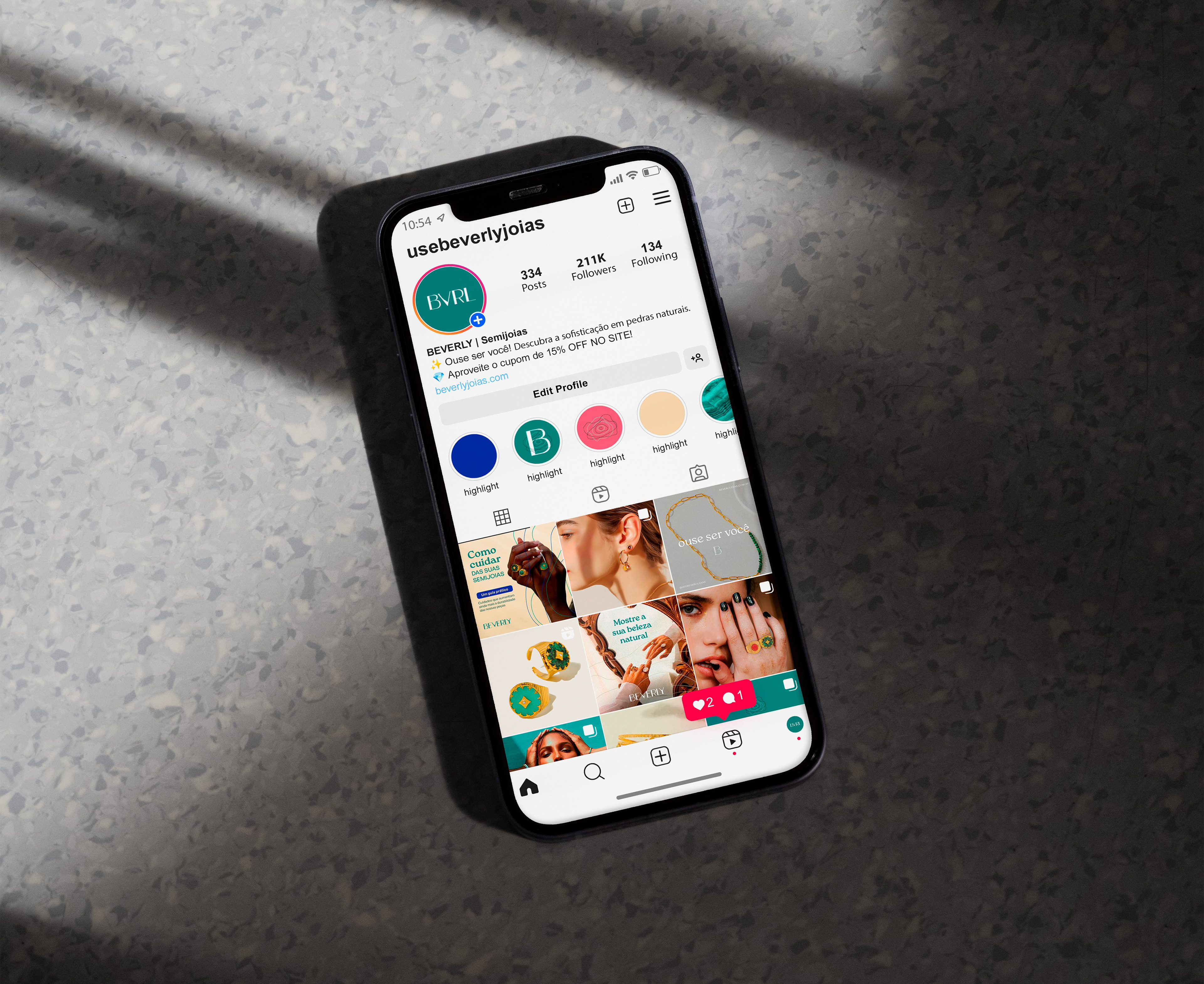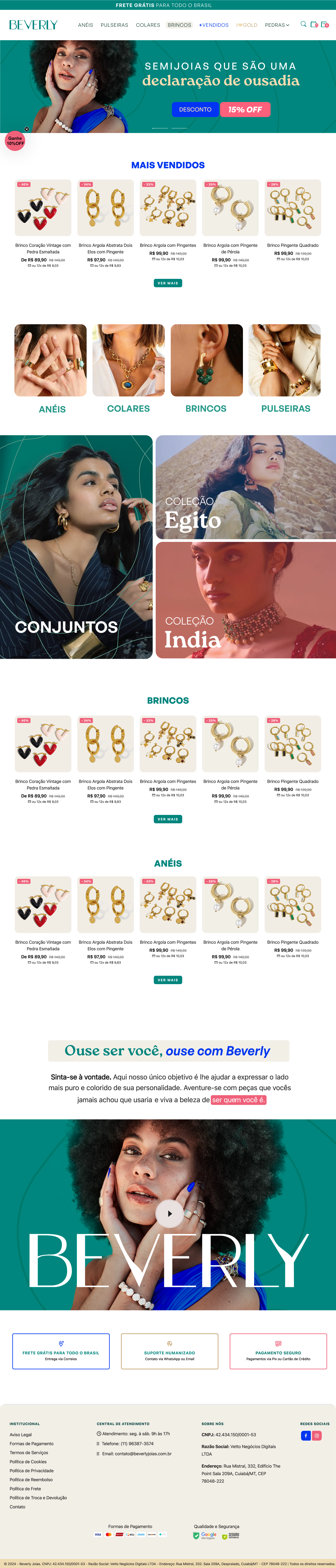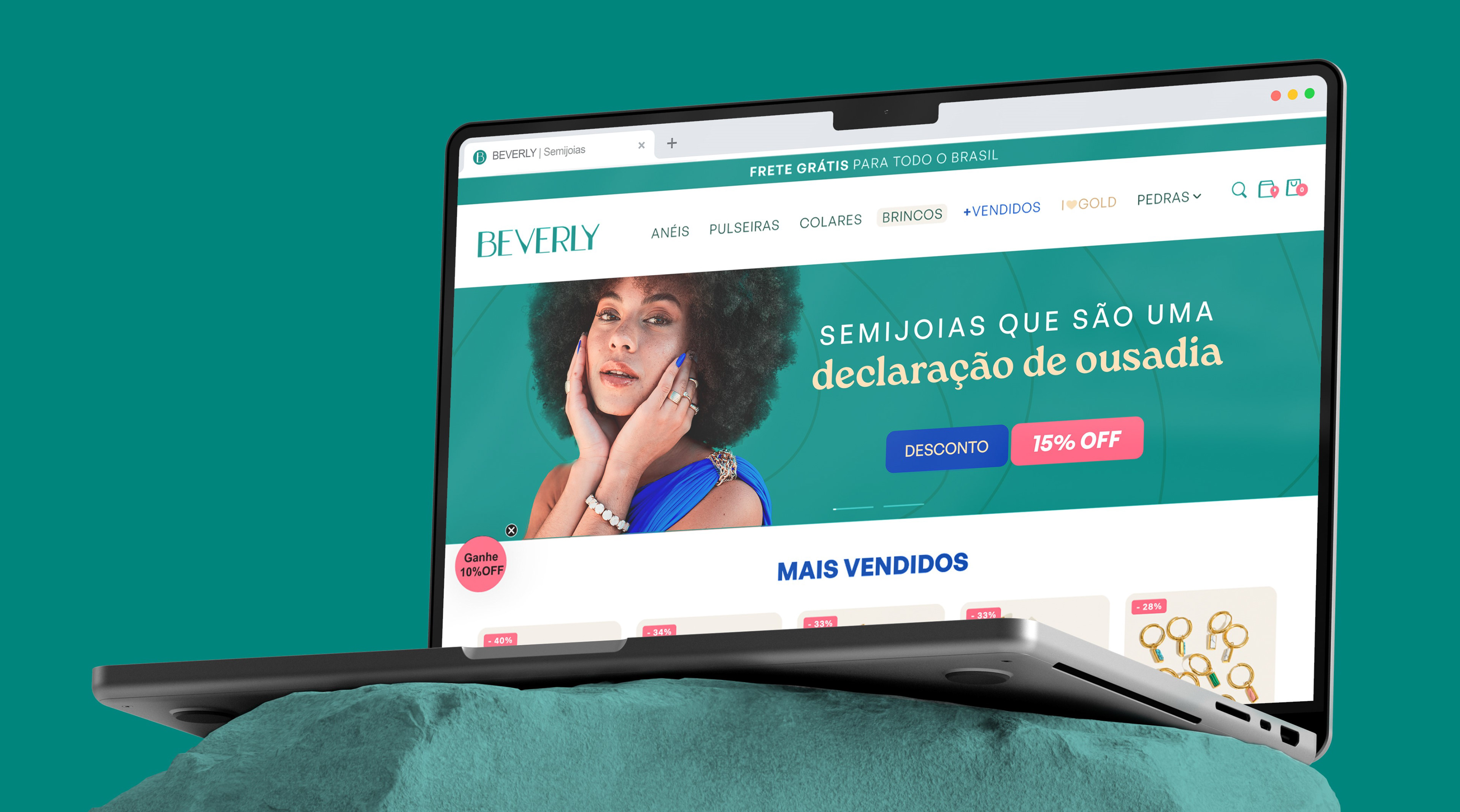 Essa é a Beverly, um ecommerce especializado em semijoias com pedras naturais que queria evitar atrelar sua imagem ao lado místico desse tipo de material, preferindo focar na elegância e ousadia de suas peças.