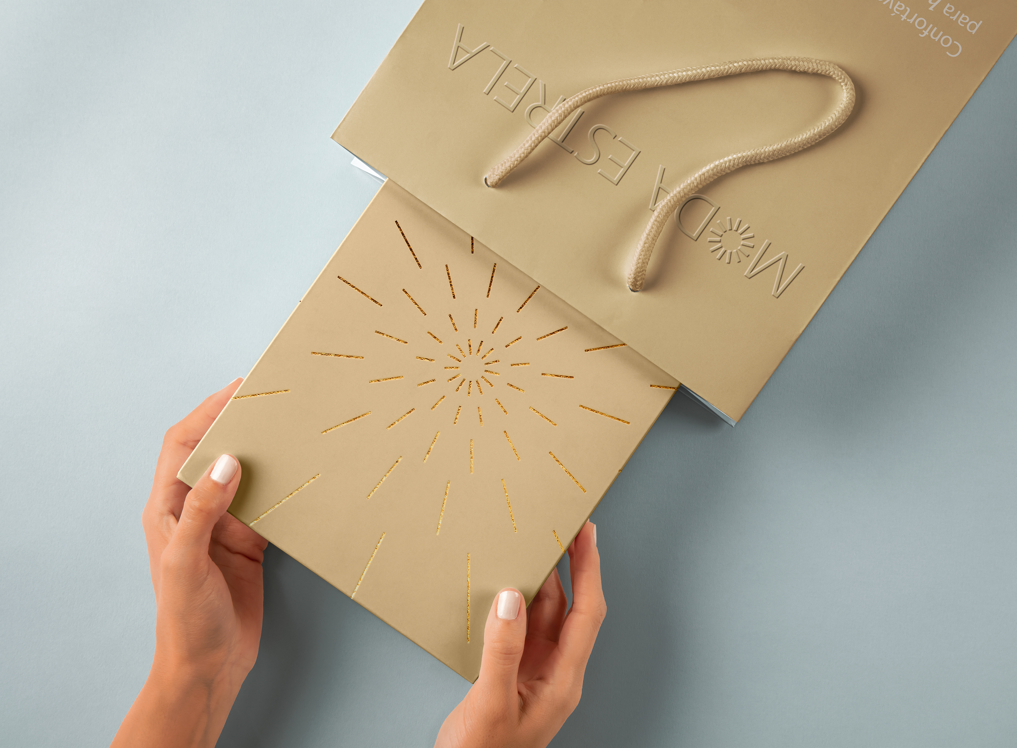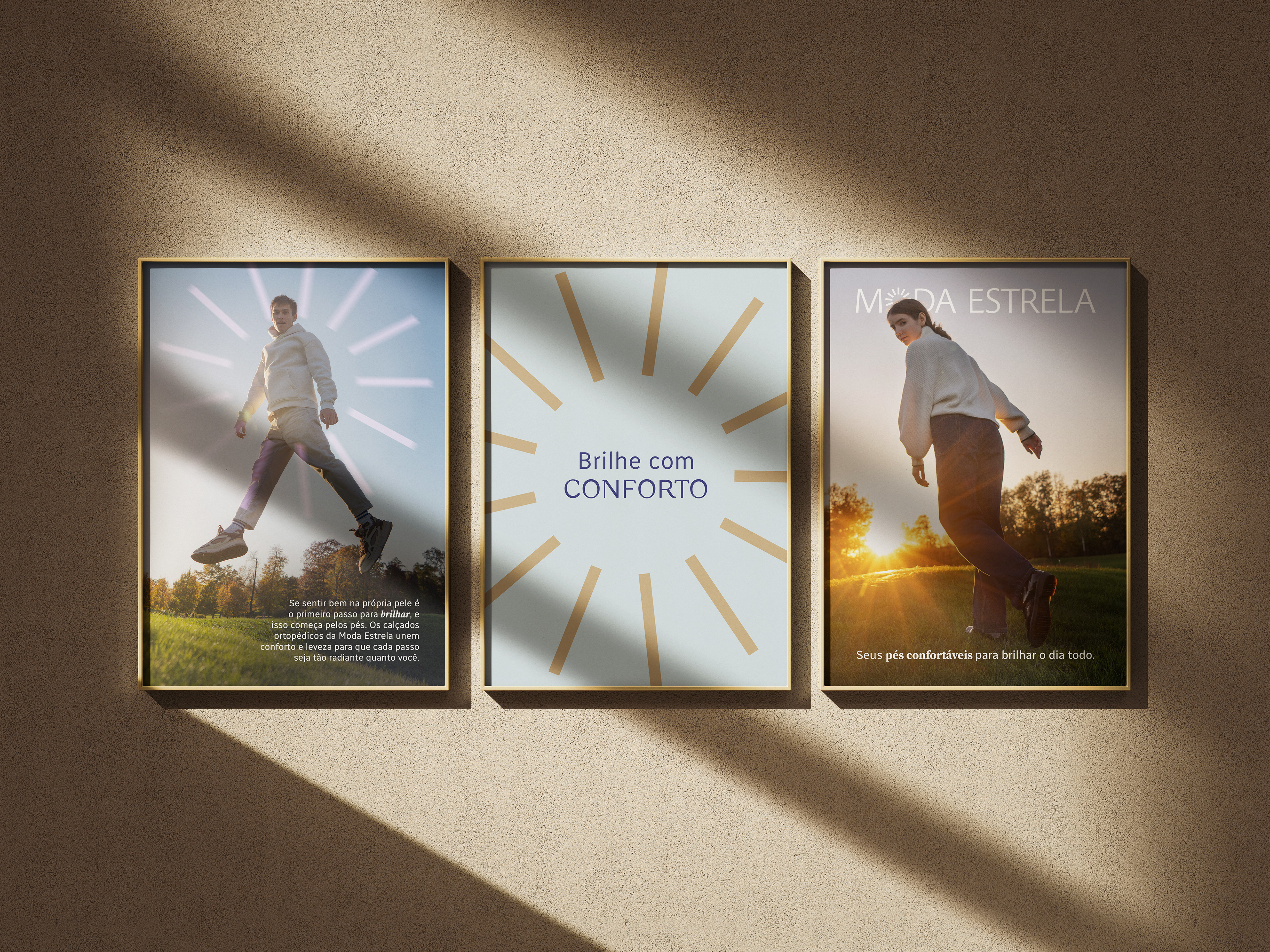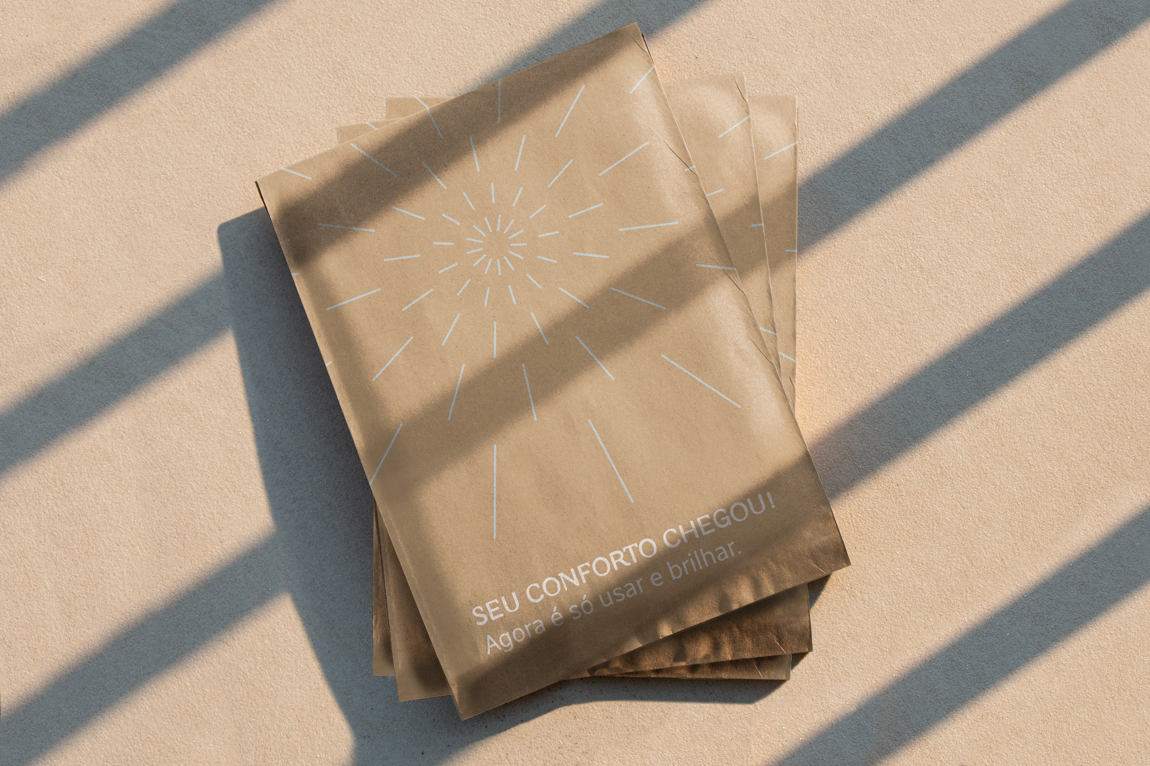 A estratégia foi criar uma linguagem visual sem gênero, que une calma, acolhimento e brilho interior. O símbolo da estrela, inspirado na forma do sol, representa energia vital, luz própria e bem-estar — reforçando a ideia de que conforto é a base para uma vida mais leve. Enquanto a paleta de cores equilibra a serenidade com o calor, convidando cada pessoa a caminhar com confiança e autenticidade.